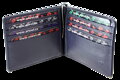 Pružina na uchytenie bankoviek, 8 vreciek na kreditné karty, 2 vnútorné vrecká a vonkajšie vrecko na mince. Šitie v modrej farbe.